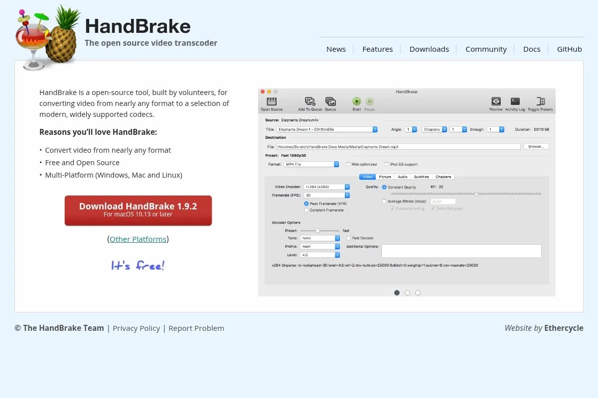 HandBrake is a free, open-source video compression tool that's available on macOS, Windows, and Linux. It supports a wide range of input formats like MP4, MKV, AVI, and MOV, making it versatile enough for most content creators.