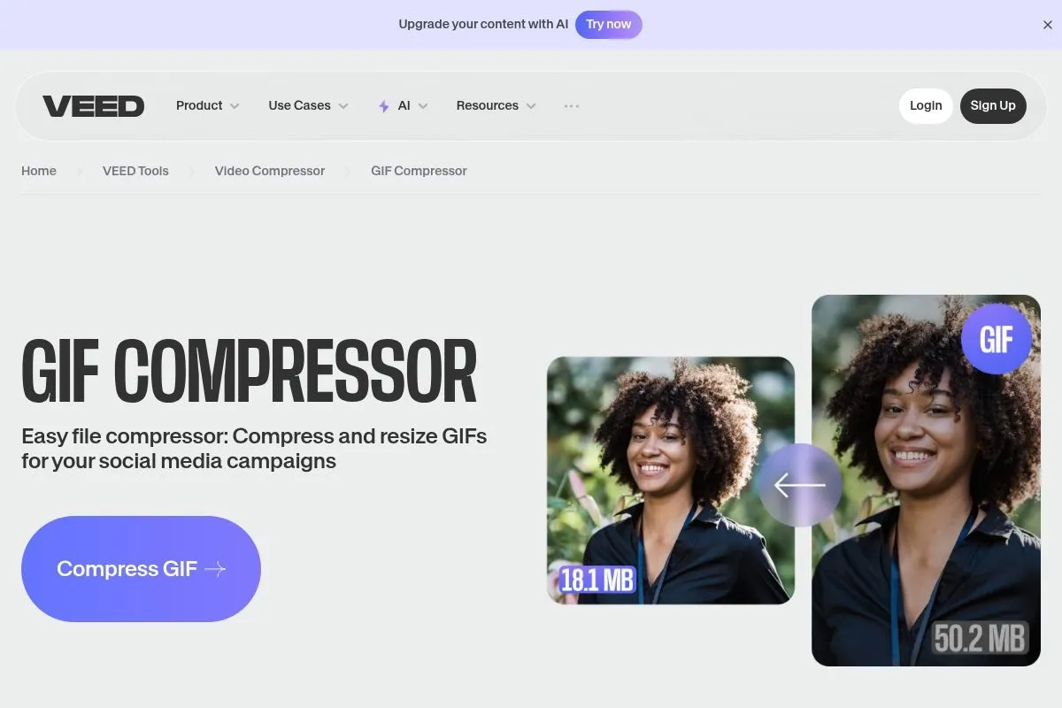 For those who like more control, VEED offers advanced options like adjusting bitrate and resolution to fine-tune your compression results. What makes VEED particularly useful is that it's part of a broader platform that includes a full suite of video editing tools, giving users the option to enhance their GIFs within the same ecosystem.