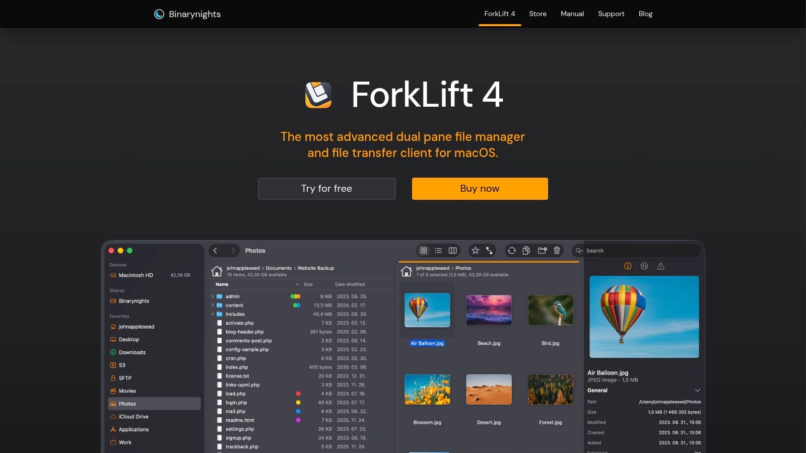 BinaryNights is the official developer website for ForkLift, a highly regarded dual-pane file manager and file transfer client for macOS. This site is the primary source for purchasing and downloading one of the best file management software for Mac, especially for users who need robust remote connection capabilities. It caters to web developers, IT professionals, and power users who frequently move files between their Mac and various servers or cloud storage services.