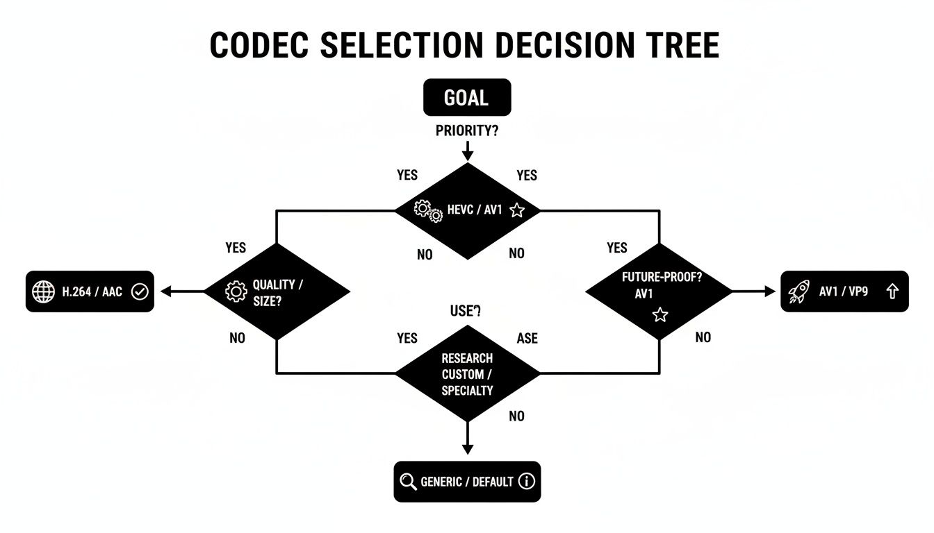 As the decision tree shows, whether your priority is maximum compatibility, the best quality-to-size ratio, or future-proofing your archive, your codec choice will point you in the right direction from the start.