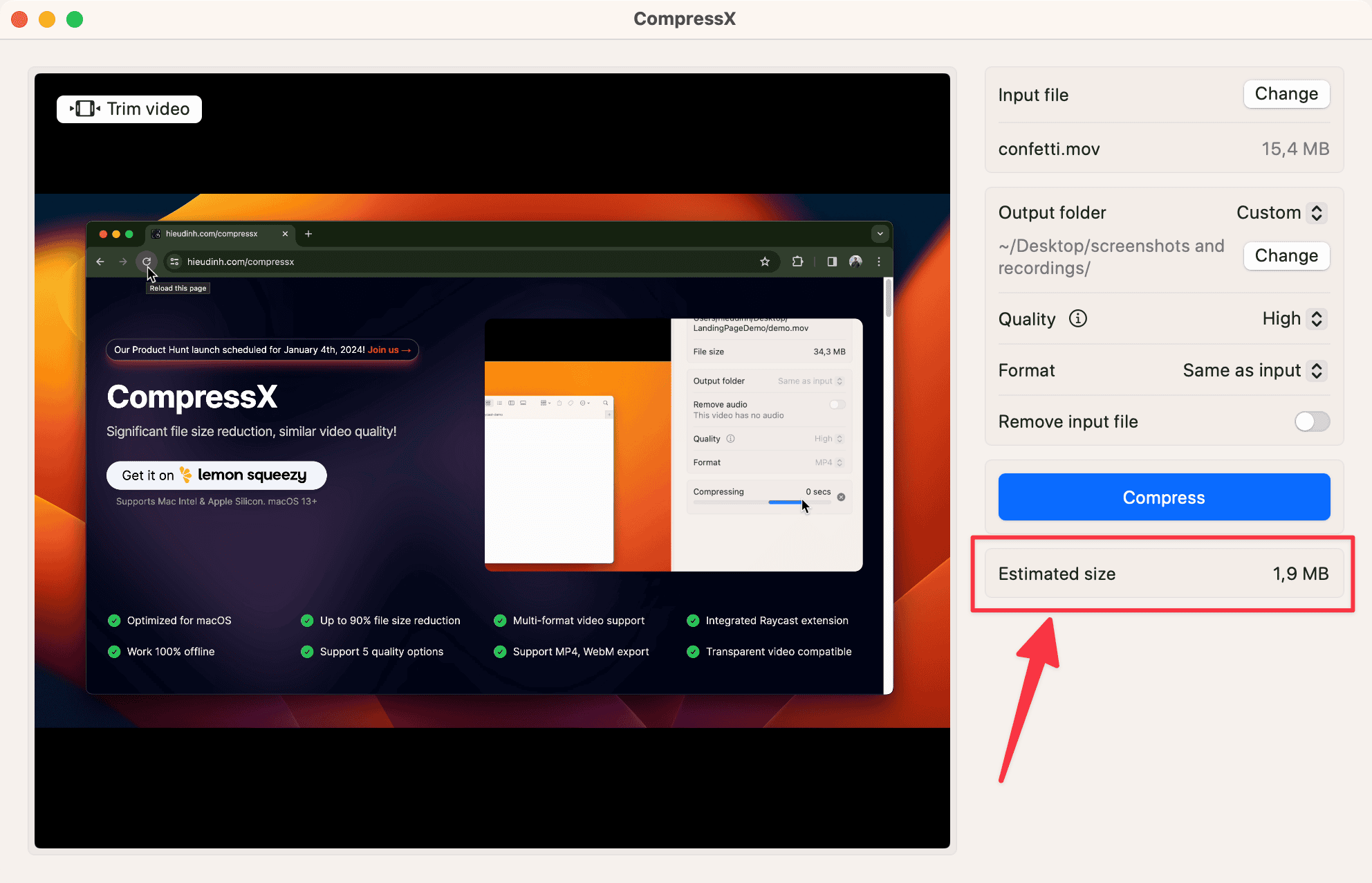 Compresto will now display the estimated file size before compression, giving you an idea of the reduction in size after compressing.