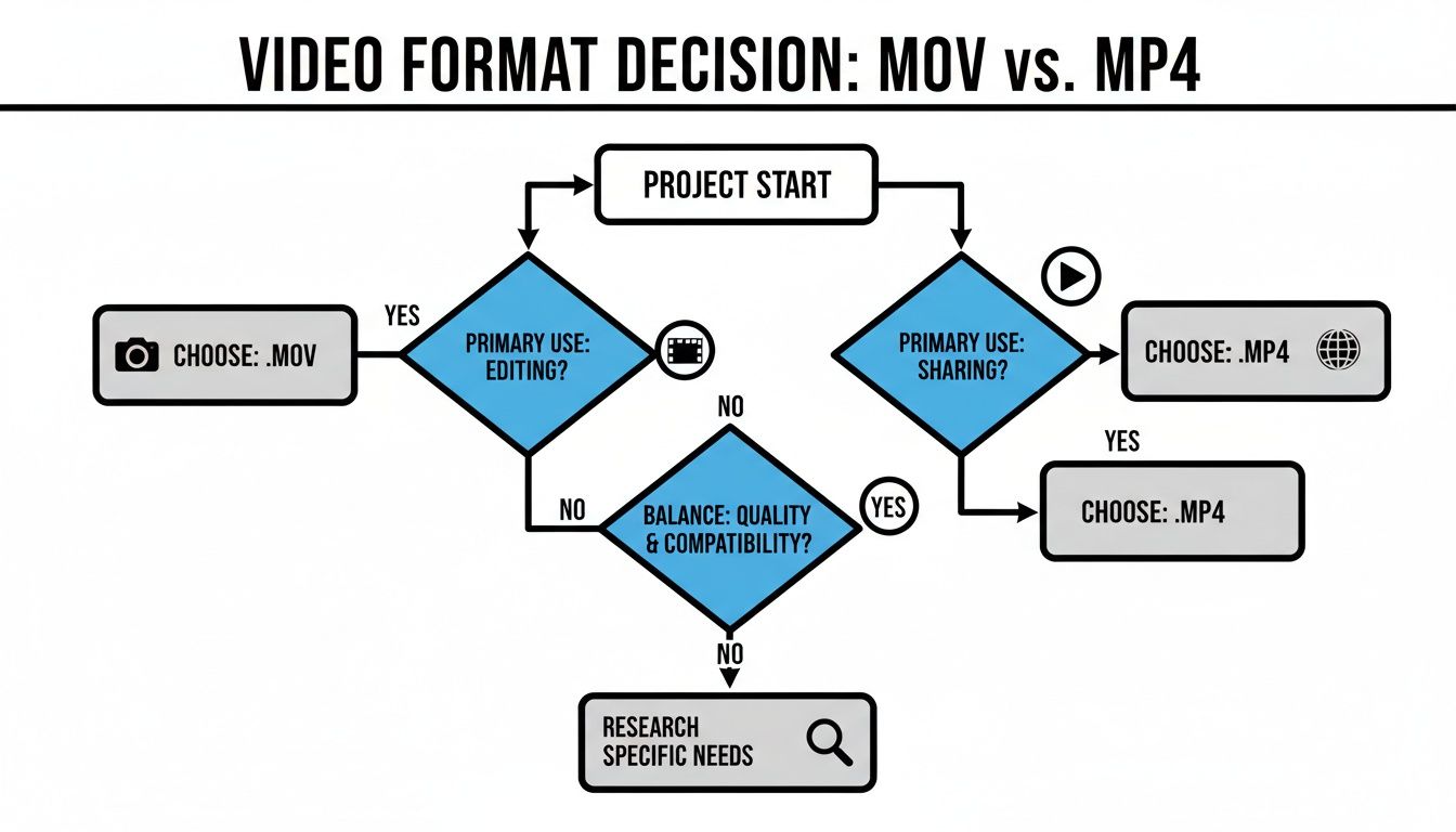 As the flowchart shows, the goal is the key. Start with editing in mind, and MOV is your best bet. If you’re just sharing, MP4 gets the job done.