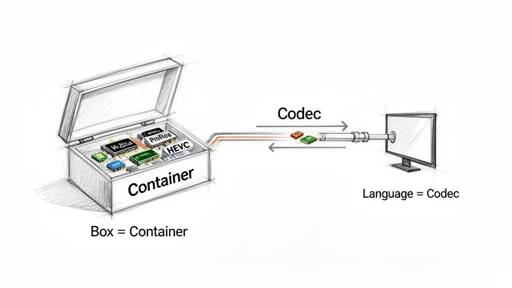 Think of the container as a box. This box—the file format itself, like .mp4 or .mov—doesn't actually determine the quality of what's inside. Its job is to hold all the different parts of your video together in one neat package.