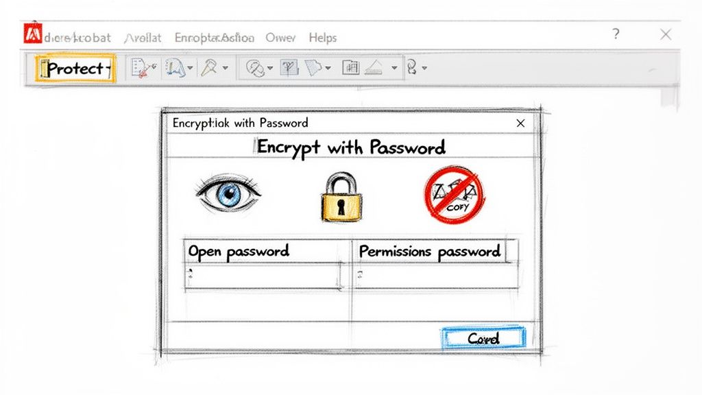 Fire up Adobe Acrobat, open your PDF, and find the Protect tool—it's usually in the right-hand panel. From there, you'll want to select Encrypt with Password. This is your command center for locking down the document.