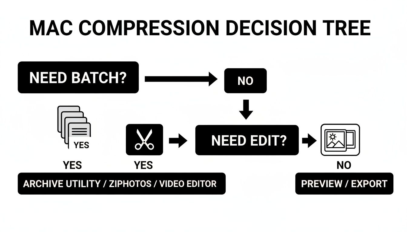 So, which one is right for you? Your choice often boils down to your specific project needs. This decision tree lays out the typical paths Mac users follow when picking a compression tool, usually starting with whether you need to process files in bulk or make edits.