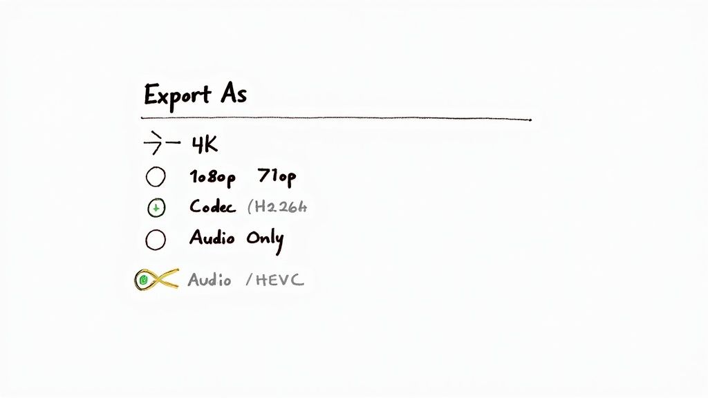 For posting to social media or sending to clients, H.264 is the safest bet. If you’re just archiving files for yourself or sharing between modern Apple devices, HEVC is a fantastic way to save disk space. If you're working with MOV files specifically, our guide on how to compress a MOV file goes into even more detail.